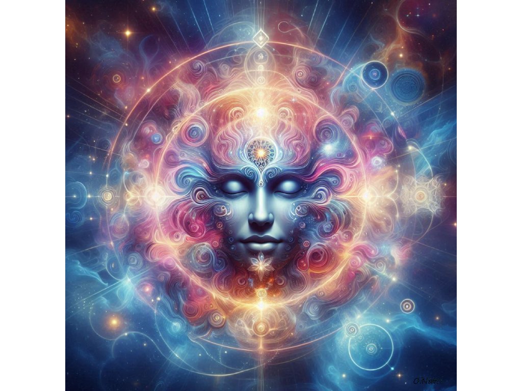 Ponořte se do fascinujícího světa energie, mystiky a harmonie. Tento obraz zobrazuje tvář kosmického vědomí – klidnou, snovou bytost zahalenou v galaktických proudech barev, světla a symbolů posvátné geometrie.